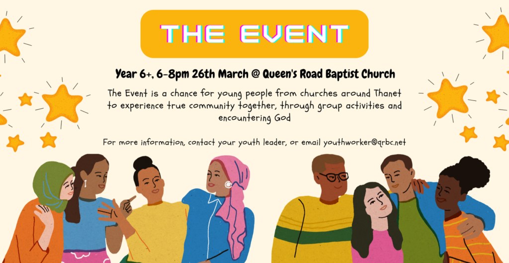 This week at YI will not be meeting at St Luke’s church hall. Instead we join the youth groups of Thanet at Queens Road Baptist church, Broadstairs, for The Event. A great opportunity for friendship, fun and learning more about God.