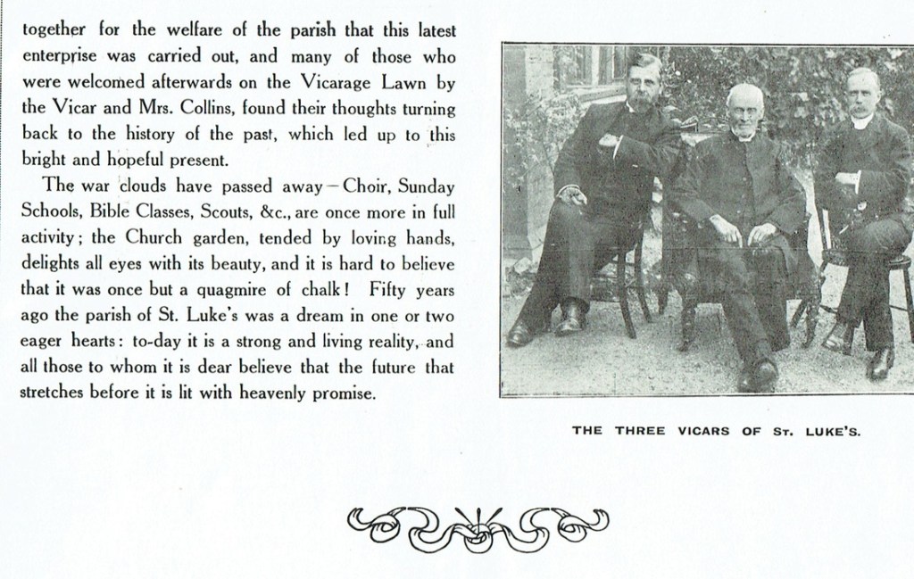 This last instalment from the history of the first 50 years at St. Luke’s starts with a summary of the work of the second vicar, Rev. Hazledine, who was vicar from 1905-1912. The main focus, however, is on the events during the time of the third vicar, Rev. Collins, 1913-1927.